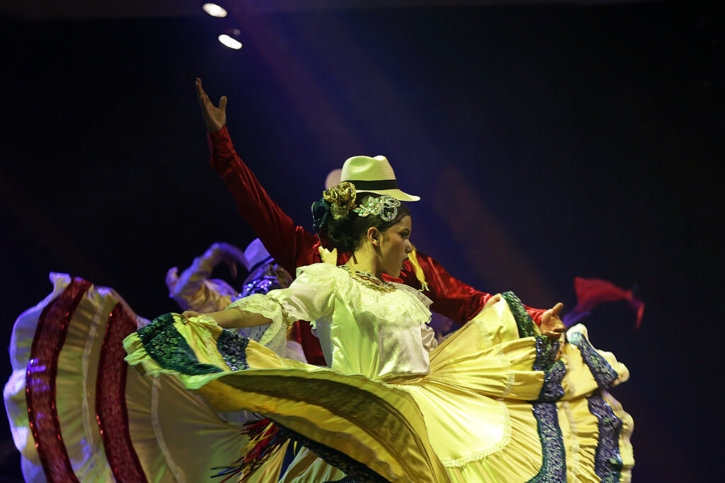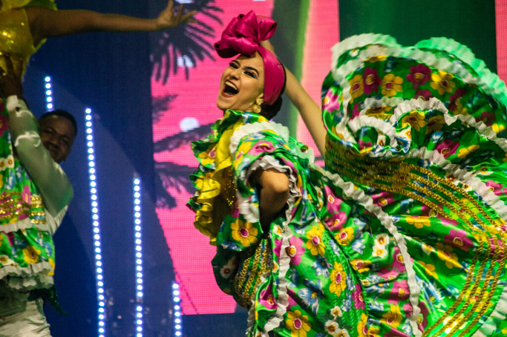 El primer bloque es un recorrido sensorial que conecta la danza y la música tradicional con sonidos que han cruzado fronteras. Cumbia, currulao, mapalé, vallenato y sanjuanero se entrelazan con bolero, boogaloo y cha-cha-chá, mientras el escenario cobra vida con piezas emblemáticas como Yo me llamo cumbia, Colombia Tierra Querida, Sanjuanero, Tierra del Olvido, Nuquí, Buenaventura y Caney.